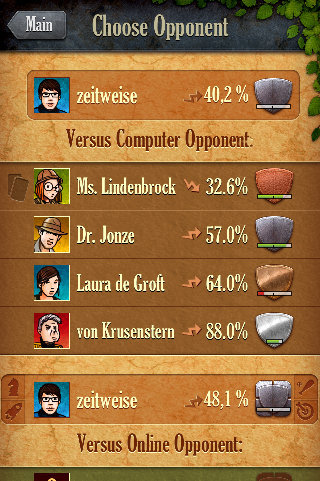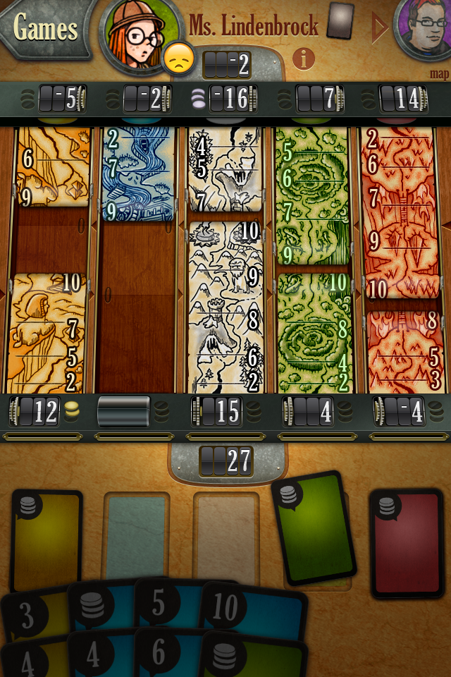 Lost Cities for iPhone allows you to play online matches against game center friends or strangers. To communicate quickly and beyond language barriers you can express how you feel about a move by sending emoticons. For a challenge you can match up against four different computer players featuring distinct skill levels and play styles. And of course there also a bunch of game center achievements to earn.